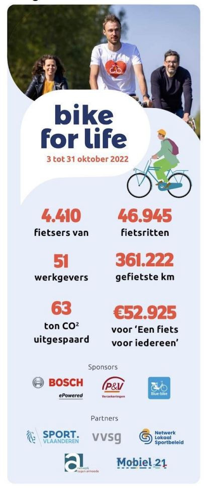Aphea.Bio, Avansa regio Antwerpen, BASF Innovation Center Gent, Biotalys, BNP Paribas Leasing Solutions, Brouwerij Westmalle, Catalent, Devgen, Fietsersbond, Gemeente Arendonk, Gemeente Borsbeek, Gemeente De Pinte, Gemeente Evergem, Gemeente Haaltert, Gemeente Herne, Gemeente Hooglede, Gemeente Kasterlee, Gemeente Lievegem, Gemeente Oud-Heverlee, Gemeente Ruiselede, Gemeente Sint-Gillis-Waas, Gemeente Tervuren, Gemeente Wachtebeke, Gemeente Wezembeek-Oppem, Gemeente Wortegem-Petegem, Gemeente Zwevegem, Gemeentebestuur Roosdaal, Gemeentebestuur Ternat, Gewestelijke Overheidsdienst Brussel, Go Atheneum, Hoboken, Groenhuis, Inasti, Lidl Belgium & Luxembourg, Lokaal bestuur Herzele, Lokaal bestuur Wingene, Samenwerkingsverband Neteland, Pfizer, Procter & Gamble, Services, Provincie West-Vlaanderen, S.W.I.F.T. SC, Sarpi Veolia, Schulman, Stad Deinze, Stad Sint-Niklaas, Stad Tienen, Stad Vilvoorde, Traject, Upway, Veneco, VF Europe, Vlaamse Overheid en de VVSG Het Bike for Life Peloton fietste gedurende één maand 361.222 km bij elkaar, een afstand die overeenkomt met negen keer de aardomtrek. De deelnemende werkgevers sponsorden de 46.945 fietsritten die hun medewerkers fietsten. Dit leverde een bedrag op van €52.925. Alle fietsritten samen waren goed voor een CO²-reductie van 63 ton. Bike for Life is een campagne van de Fietsersbond vzw in samenwerking met Cera, Bosch eBike Systems, P&V Verzekeringen, de Vlaamse overheid, Sport Vlaanderen, de Vereniging voor Vlaamse Steden en Gemeenten, CM, het Netwerk tegen Armoede, het Netwerk Lokaal Sportbeleid, Mobiel 21, Cycling Vlaanderen en Blue-bike.